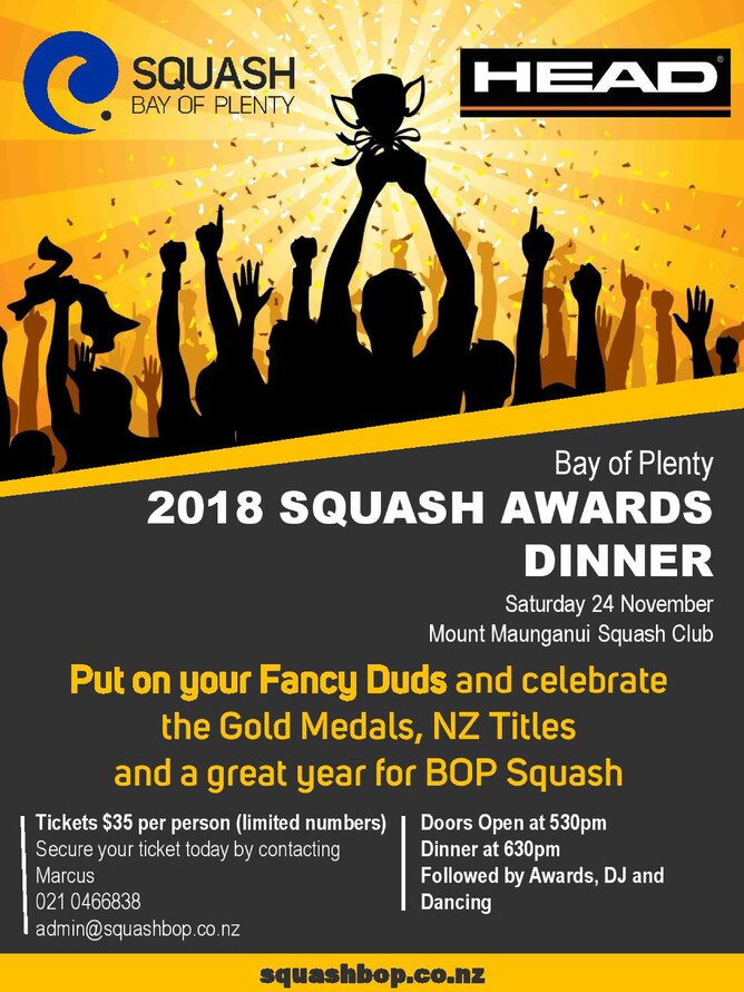 It's time to celebrate! The annual Squash BOP Awards Dinner will be held at the Mount Maunganui Squash Club on November 24th.
